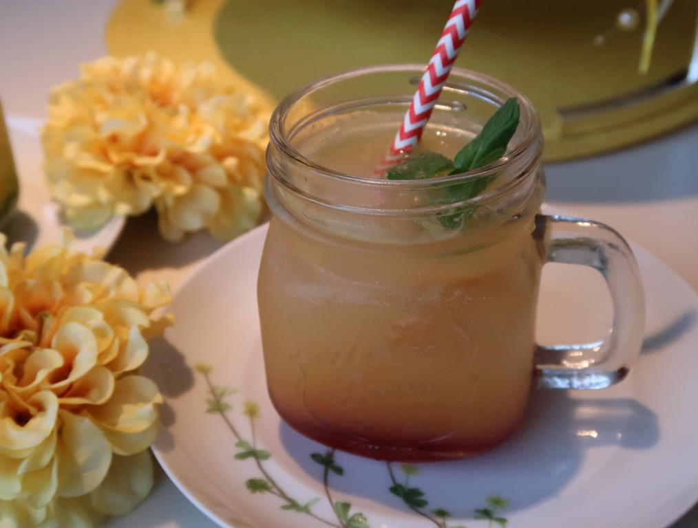 ピンクは、ザクロ酢、オレンジジュースのソーダ。イエローは、黄パプリカ、オレンジジュース、蜂蜜のドリンクだよ。