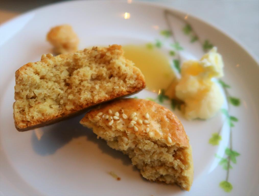 アフタヌーンティーセットに欠かせないものがスコーンですが、ふすま粉を使って小麦粉を最小限に抑え、低糖質を実現。ほろほろなので、半分に割らずに食べるといいよ。