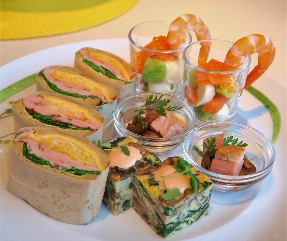 大理石のような模様を編み出しているフリッタータ、カフェで食べるようなサンドイッチのパンも低糖質の別注品(ベーカリー ル・パン製)。