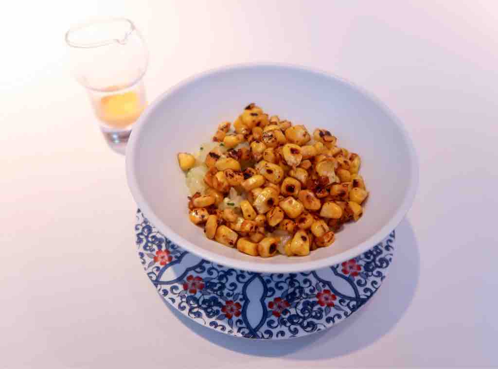 宮古島の茶豆は、枝豆に似ているがもっと濃厚。シャキッとしたスナップえんどう、長時間煮込んで甘みを引き出したポロネギ。カシューナッツも。