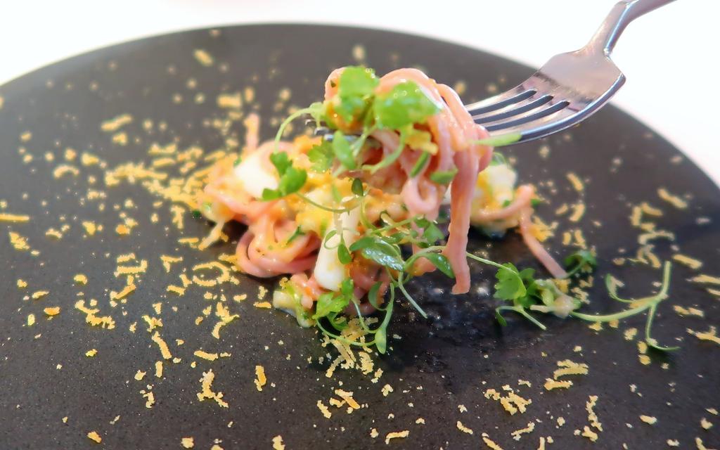 唐墨、ビネガー、オリーブオイルとオーダーメイドの塩で味付け。まずは魚だけをそのまま味わってくださいと。その後野菜と。