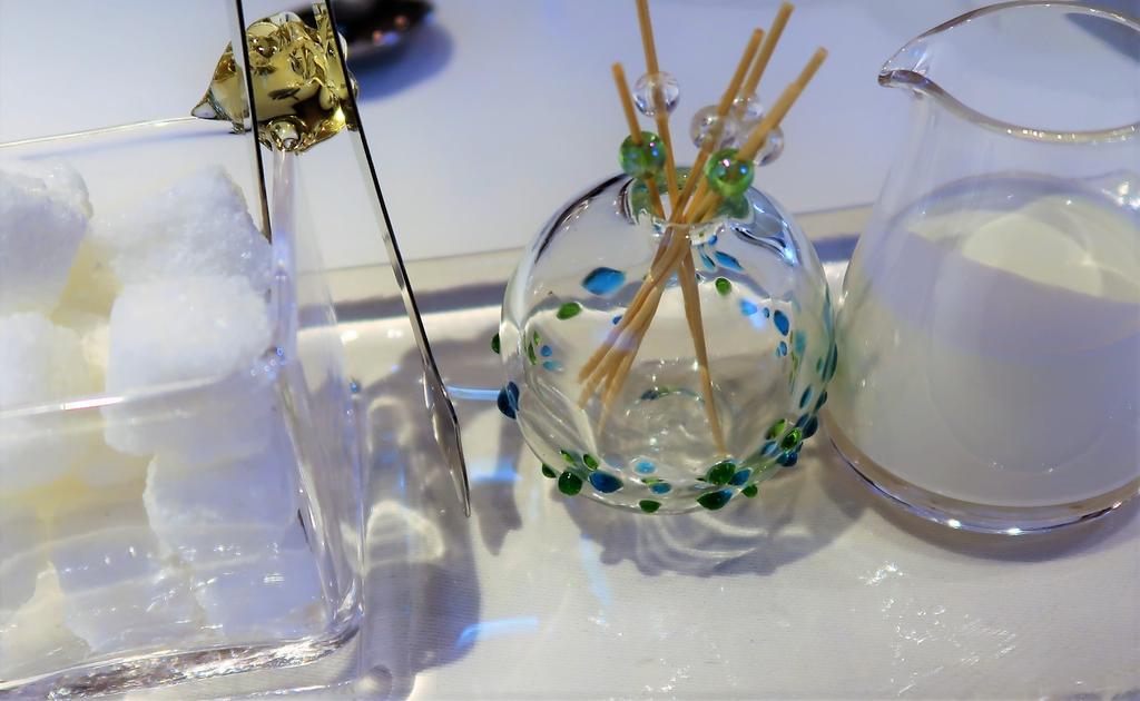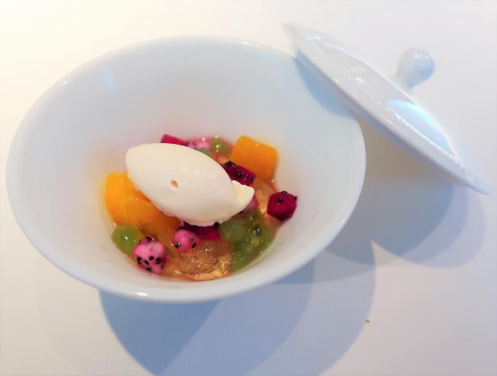 瞬間シャーベットのバジルのソースは卓上でサーブ。