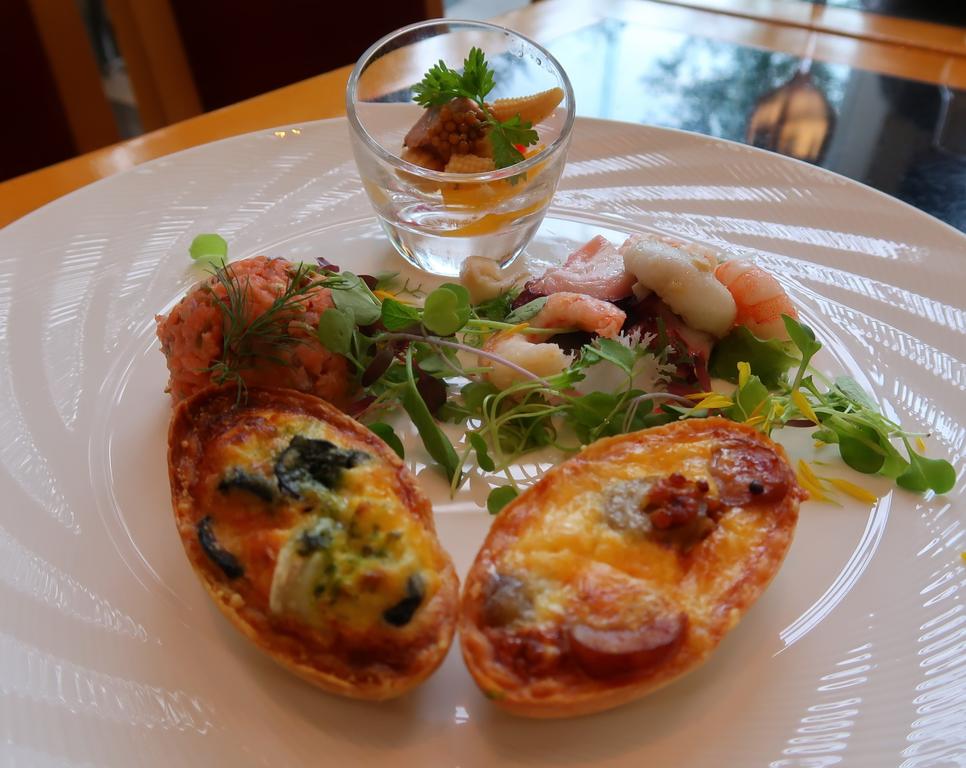 2種類のキッシュ、サーモン、シーフードマリネなど。