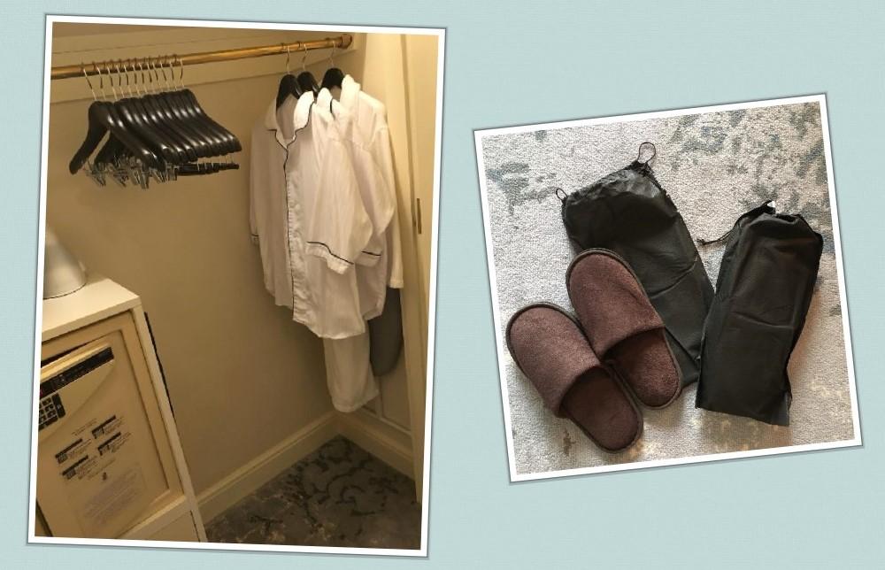 クローゼットに十分な数のハンガー。ぶあつい茶色のタオル地スリッパ。