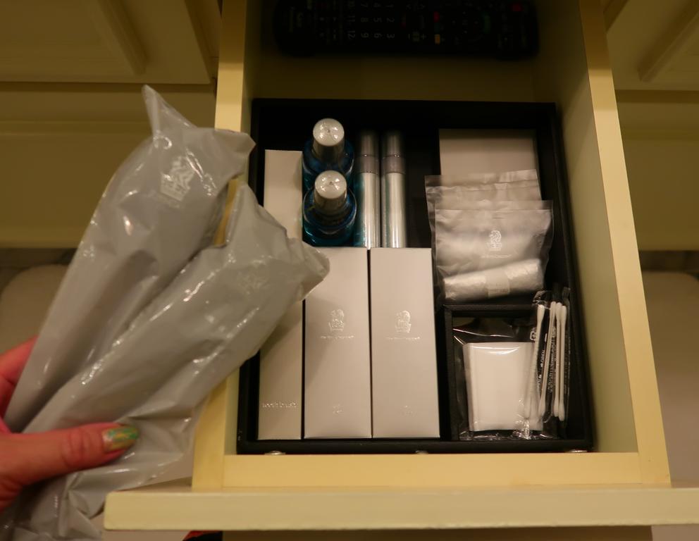 歯ブラシやシャワーキャップのほか、めちゃ大きなブラシ、マウスウォッシュ、シェービングクリームなどなど。