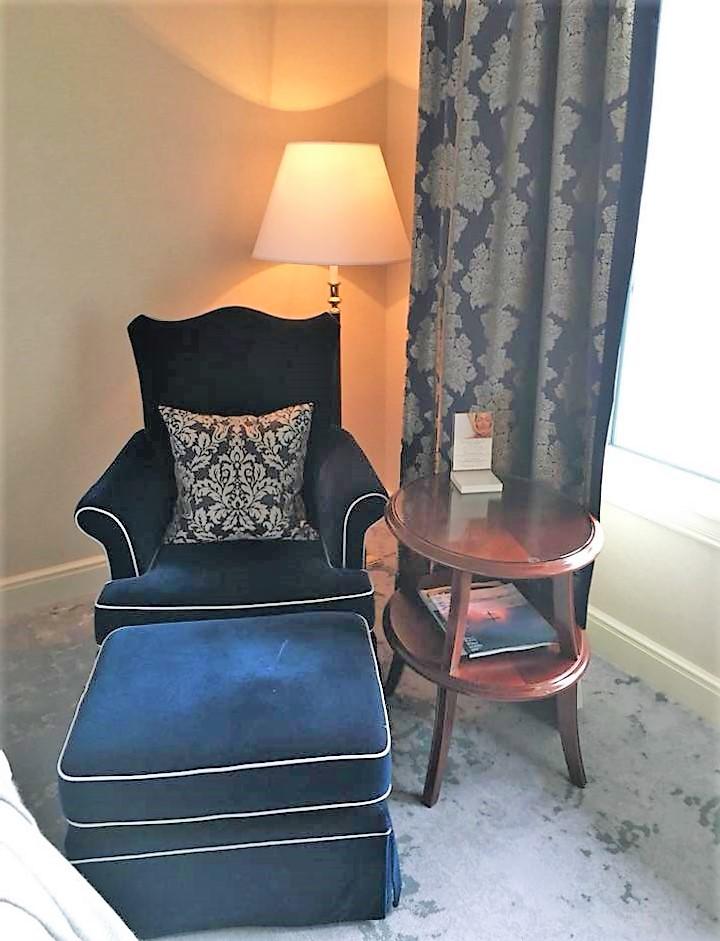 ベッドサイドにオットマンつきの一人がけソファ。