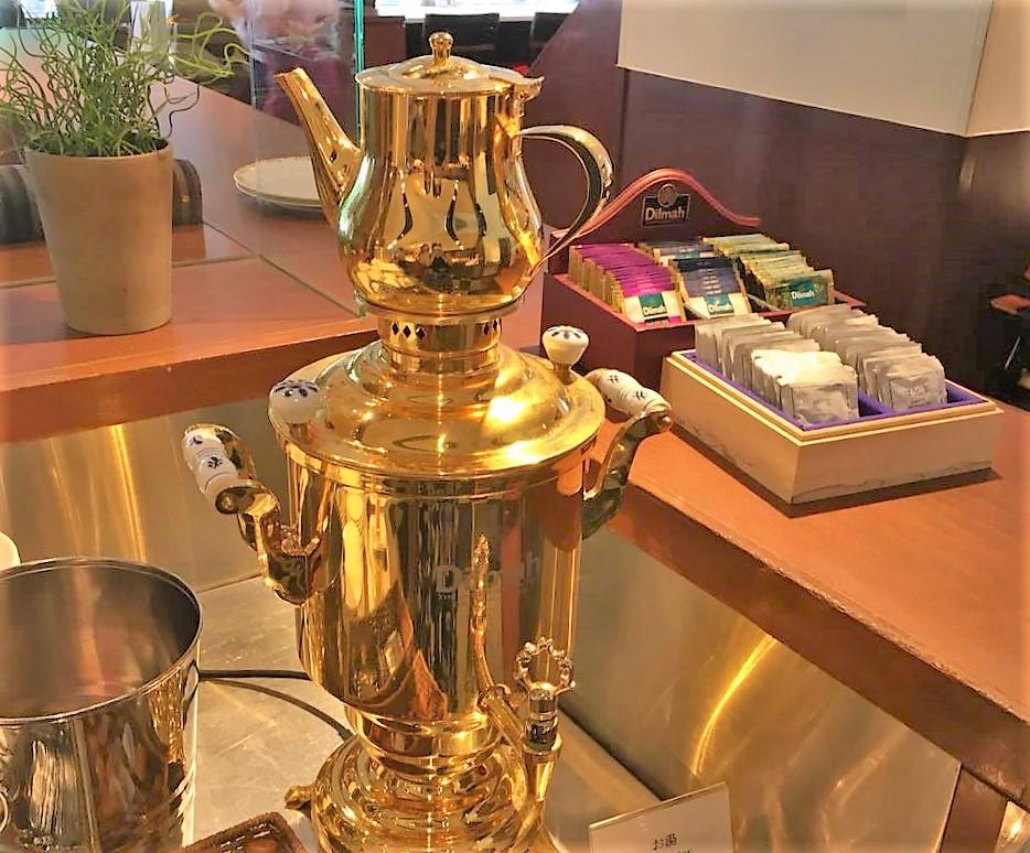 珈琲はマシンで豆から。紅茶はディルマ。お湯のポットがかわいい~♪