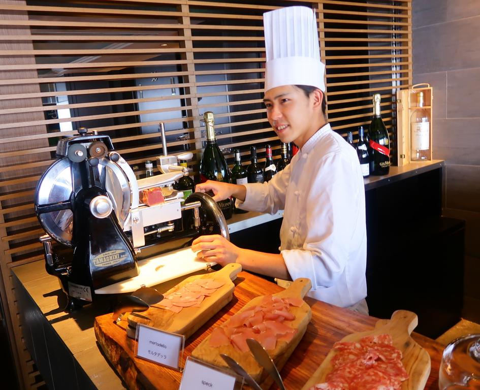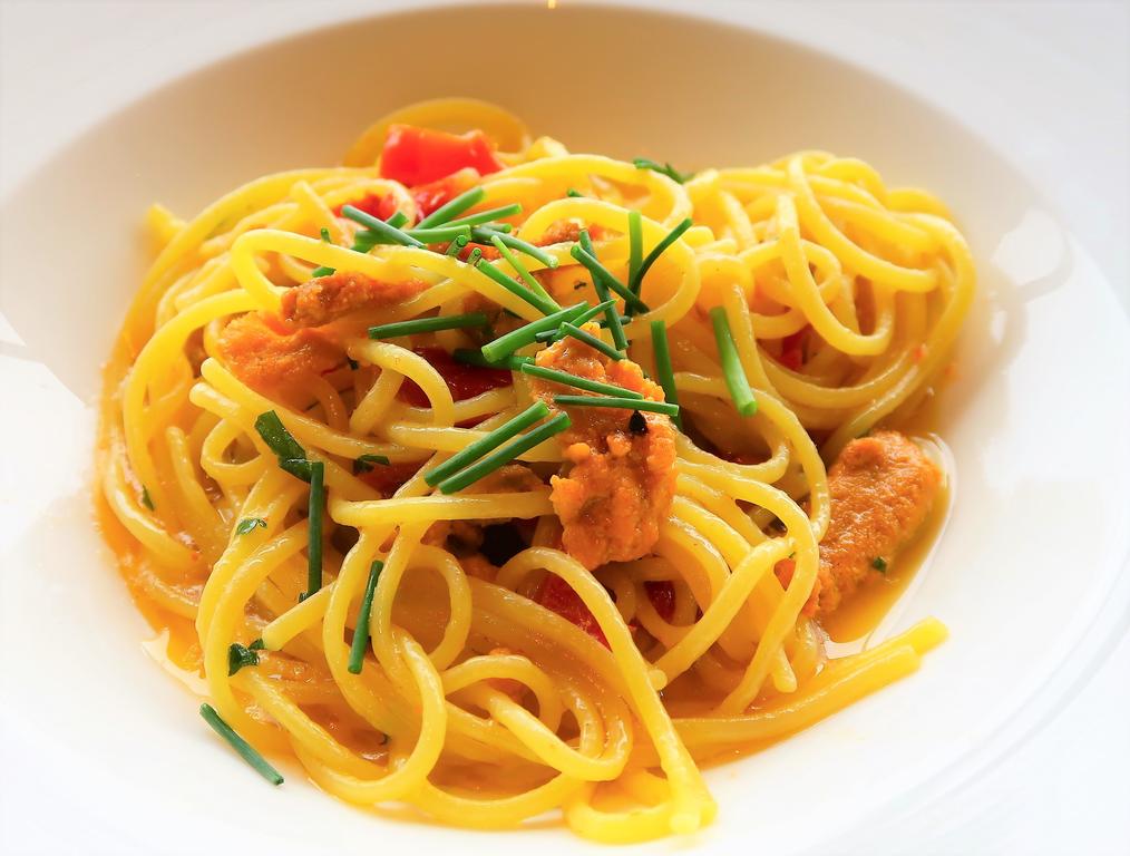 「egg型」という卵を練り込みのロングパスタに、ソースは「生うに、セミドライトマト、チャイブのアーリオオーリオ」をチョイス。