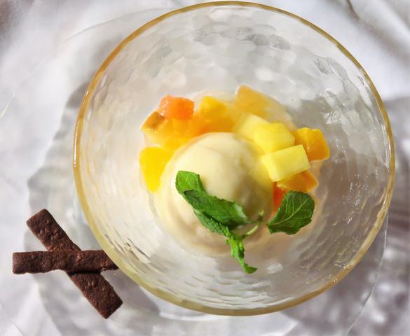 デザートは、洋梨のアイスにパインやオレンジなどのフルーツがけ。