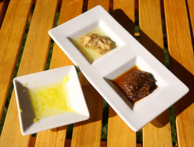 玉葱が甘いグレイビーソースと、アンチョビのコクがあるニンニクのソース、淡路島平岡農園のレモンだれをつけて。