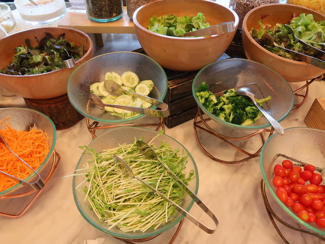 サラダにハム、ジュース、ほうれん草のスムージーなどからスタート。