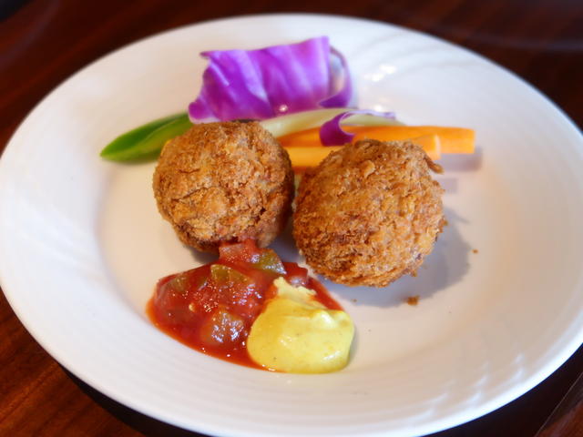 「メンチカツコロッケ」を、サルサソースとカレーソースでいただきました。