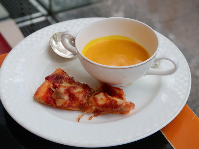 サラダのドレッシングは3種類、チキンと茸のピザ、パンプキンのクリームスープ。
