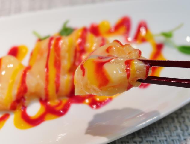フルーティな2色のマヨネーズソースがかかった海老マヨ❣️