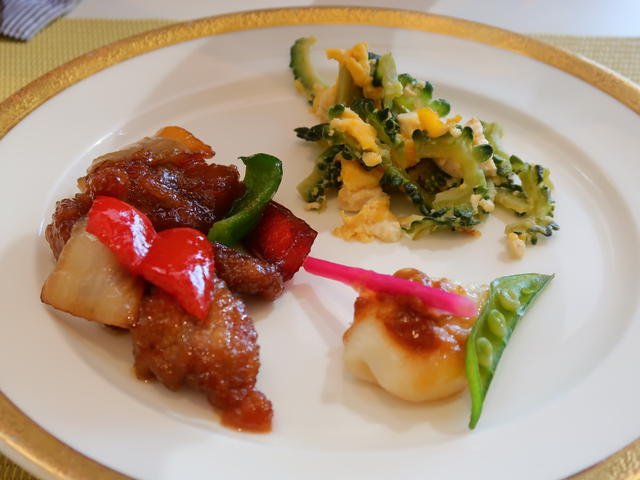 ・黒酢の酢豚、白身魚の府中味噌焼き、海鮮ゴーヤチャンプルー