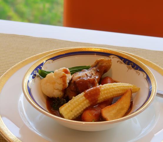 ANAクラウンプラザホテル札幌のレシピで、カレー味のチキンドラムスティック、カリフラワー88ポテト、ソーセージ等をカレーソースで食べる、北海道のスープカレー。