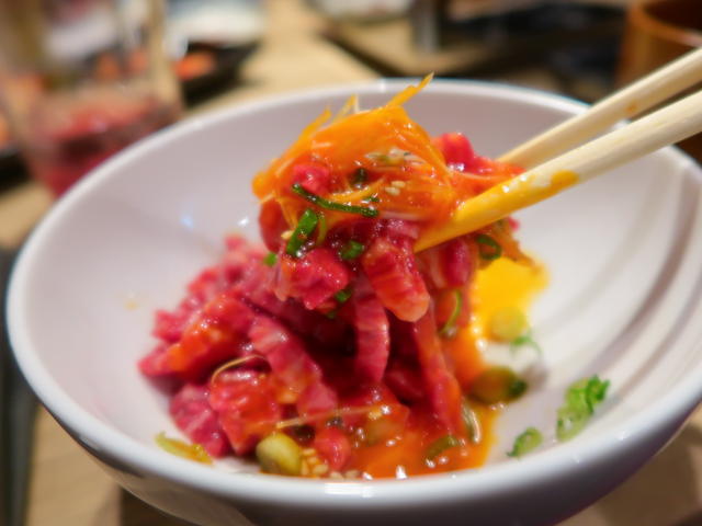 太目に切られたきれいなお肉に卵黄と薬味をからめて混ぜて。