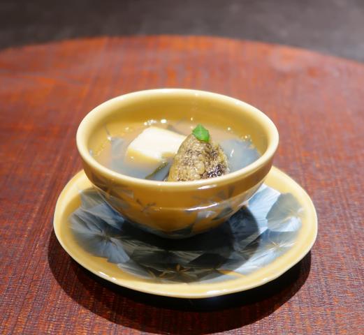 若芽で巻いて蒸しあげた干し鮑。優しいだしが張ってあってほっこり。
