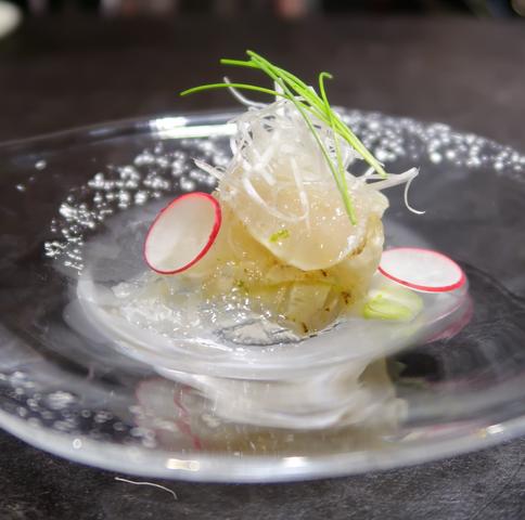 フグのだしのジュレでもっちりとしたトラフグの粗身と、ぷりっとした皮。