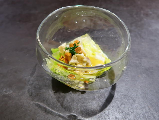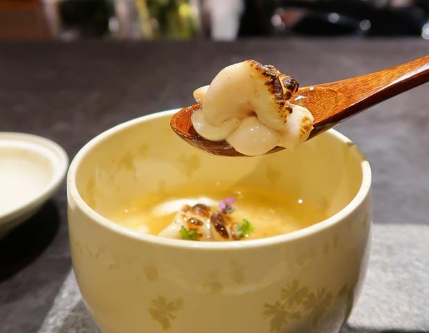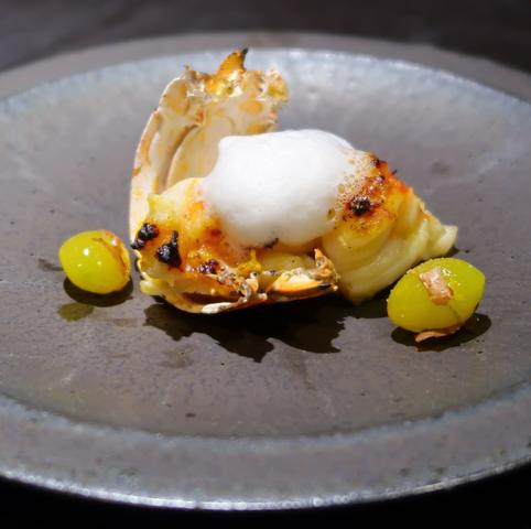 わぁ、ごろっとした身に、アーモンドミルクのエスプーマ。