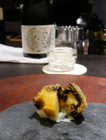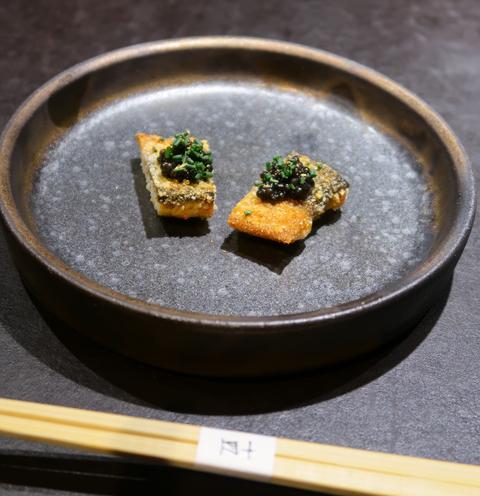 カダイフをつけてサクサクに揚げた衣とアワビの間に肝が!