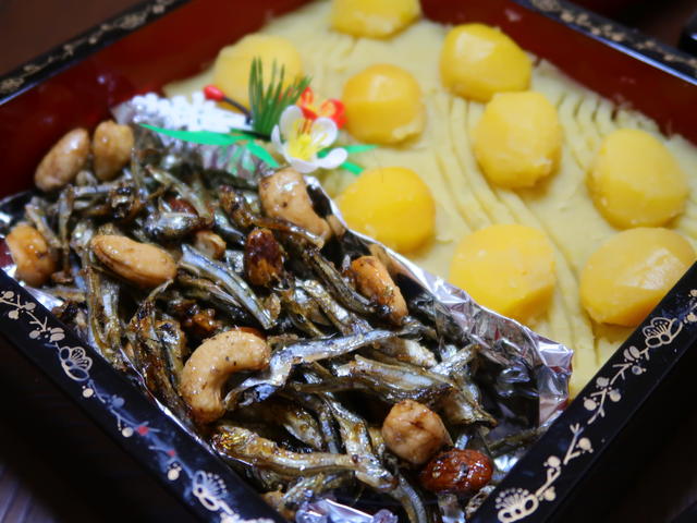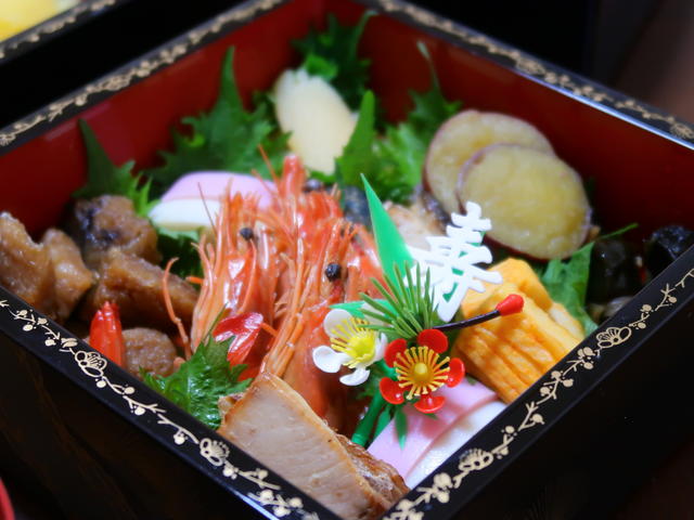 30日の夜にお買物、31日の朝に2時間ほどで作ったものと、31日のお昼ごろに阪神百貨店で2人前3000円くらいのおせちを2パック買って、お重に適当に詰めました!
