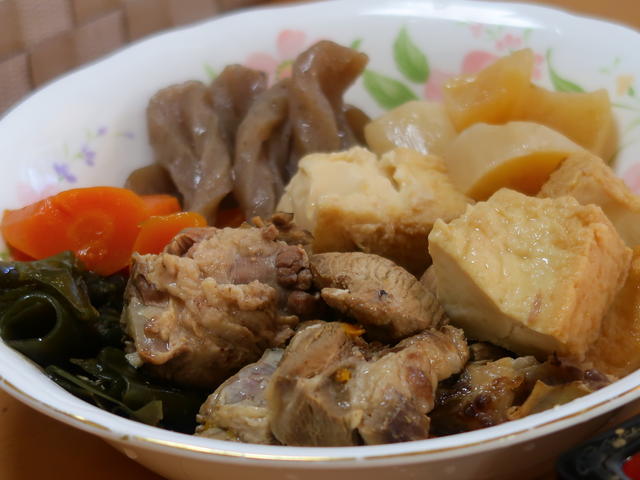 豚スペアリブを下茹でして、こんぶ、こんにゃく、だいこん、人参、厚揚げと一緒に圧力鍋で炊く。味付けは麺つゆと、お雑煮用の出汁、お醤油などで調整。