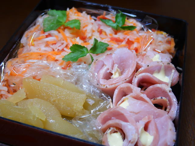 紅白なます、ハムフラワー、かずのこ醤油漬け。