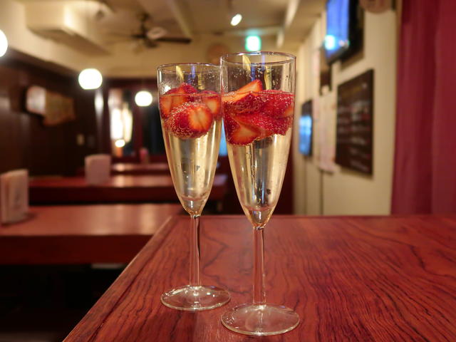 泡に浸かったいちごは、シュワシュワしていていっそう美味しい。