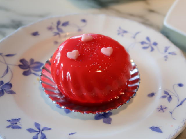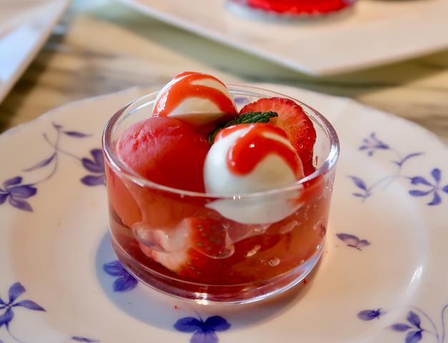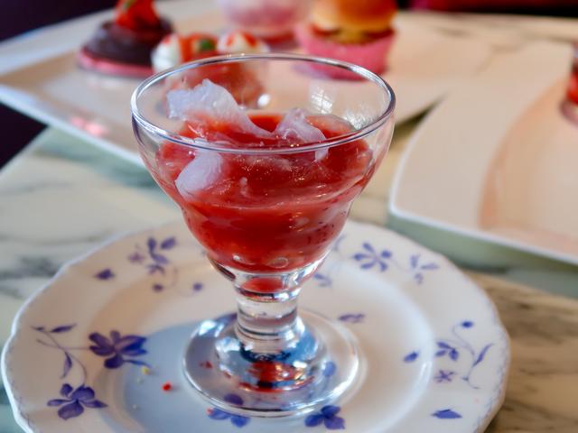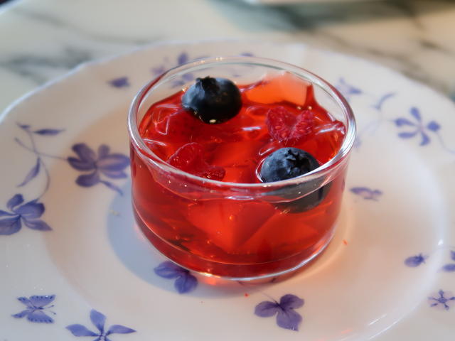 白ワインでコンポートしたトマト、ヨーグルトとクリームチーズのムース、苺とトマトのコンポートゼリー。