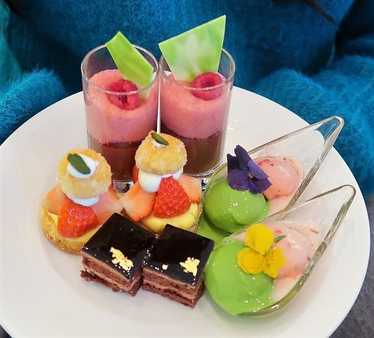 ヴェリーヌ(チョコムースにフランボワーズの泡)、シュータルト(お砂糖をまぶしたシュー生地にカスタード、フレッシュイチゴ、ピスタチオ)、オペラ、イチゴシャーベット&抹茶アイス