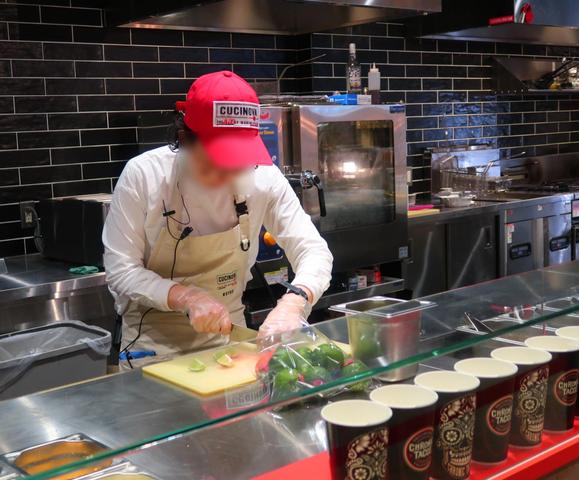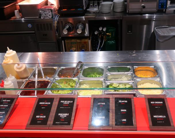 コーン、ピーマン、アボカドなどのさまざまな素材やトッピング、ソースをカスタマイズできます。
