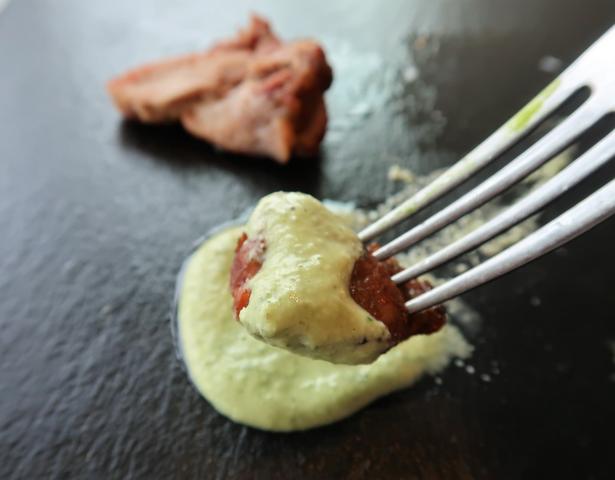 下味がしっかりとついた三田ポークに、レモンマヨネーズのような味のするきゅうりのソースをつけて。