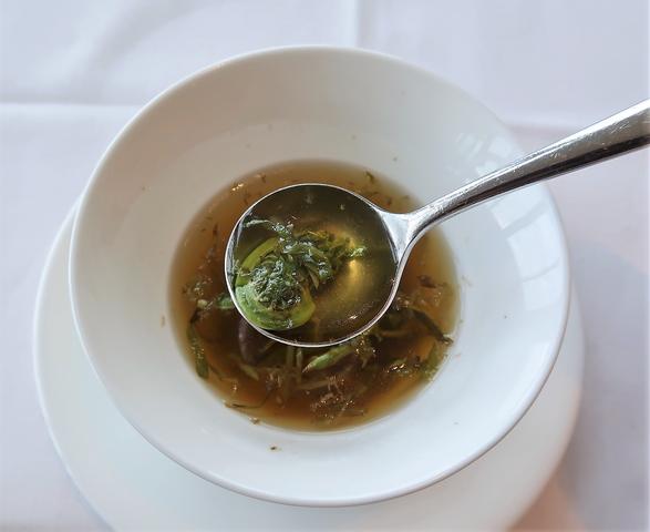 優しい味わいなのにうまみはしっかりのコンソメスープに山菜の苦み。