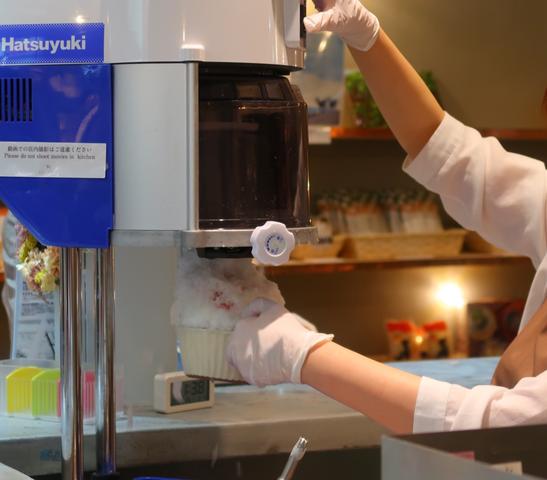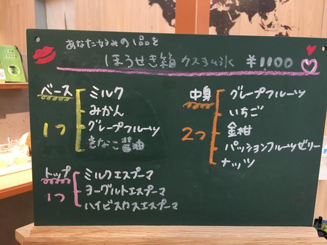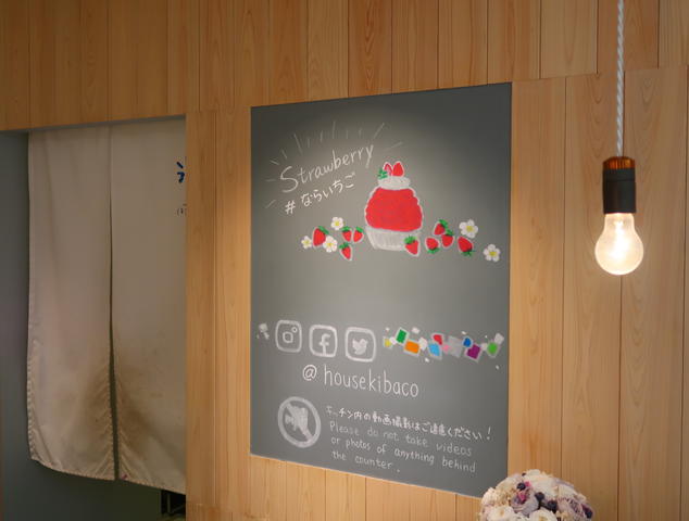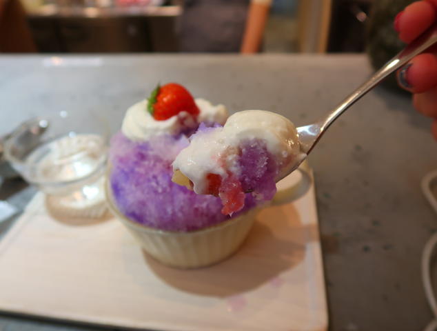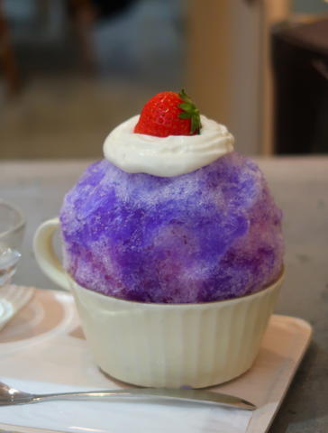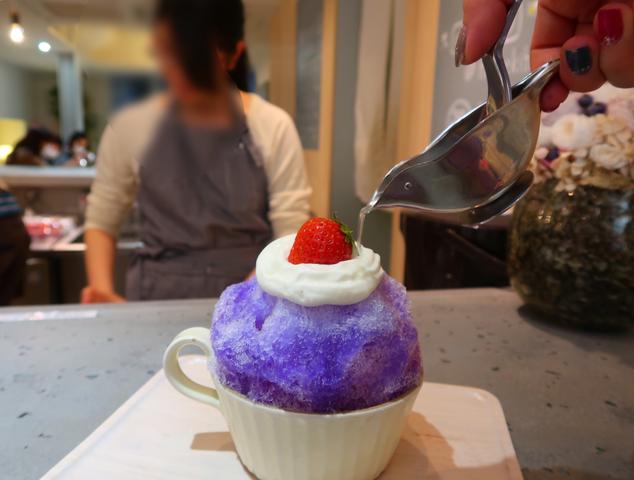季節の果物、バタフライピーシロップ、レモンシロップ、キウイシロップを使ったかき氷で、今の季節のフルーツは「いちご」でした。