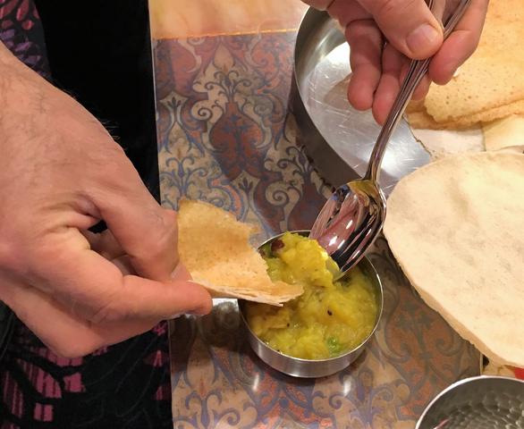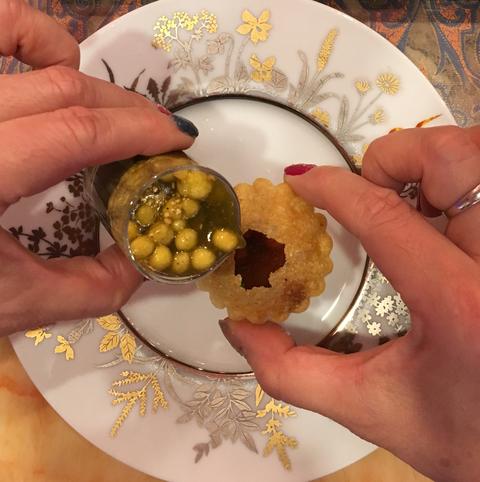 サクサクの豆スナックの皮の中にスパイシーなミネストローネみたいなのが入っていて、この穴にめがけてミント水を注ぎます。