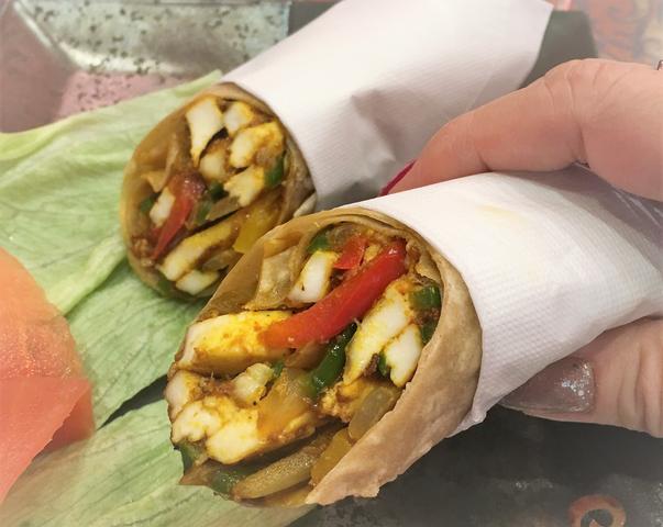 カティーロールは、ロマリロティ(全粒粉の薄いパン)でスパイシーな具を巻いたラップサンド。