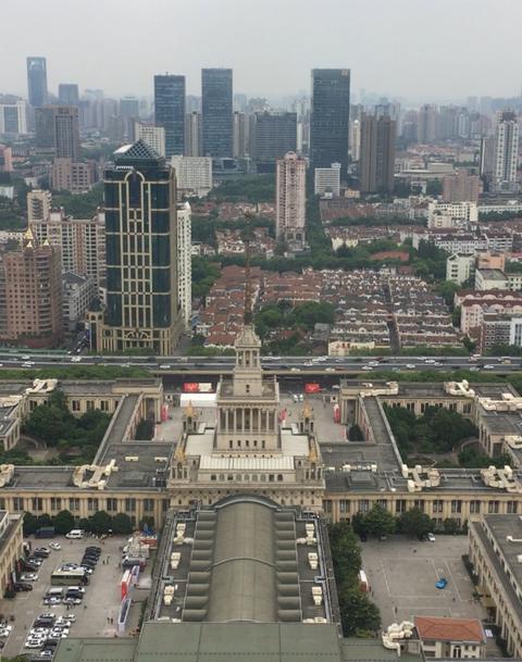 窓から見える上海中心部の街並み。
