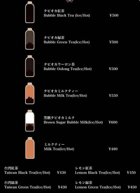 台湾紅茶、台湾緑茶、ウーロン茶、ミルクティー、黒糖ミルクなど、最近のお店の中ではシンプル。