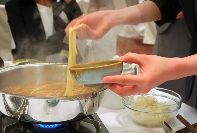淡路独特の製法で作られる極細麺「御陵糸」と、2㎜の極太麺「おのころ糸」。