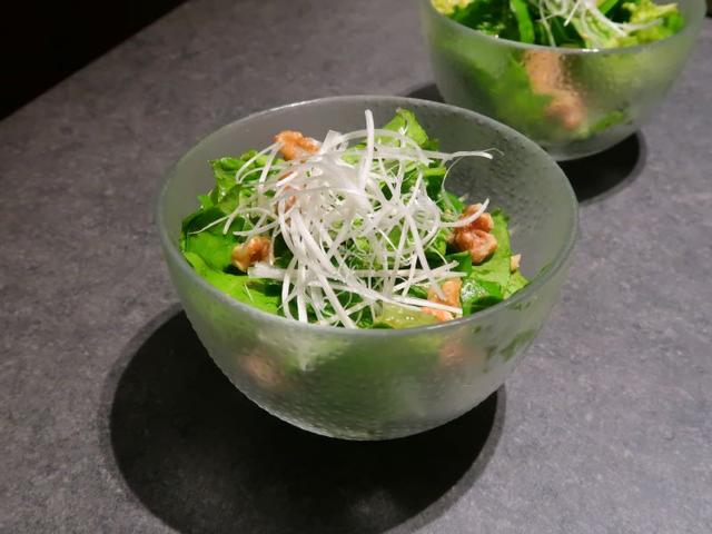 まろやかなドレッシング、香ばしくコクのあるクルミ、器もきれいで良い〜👍