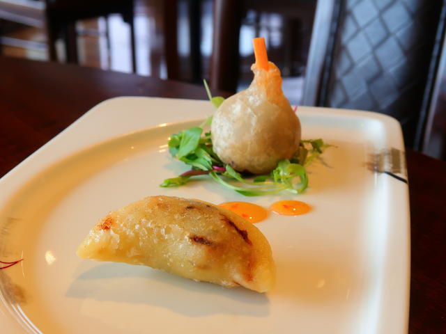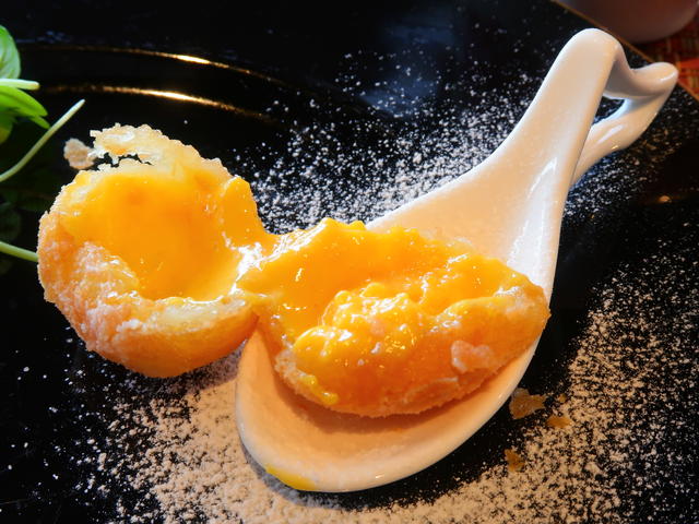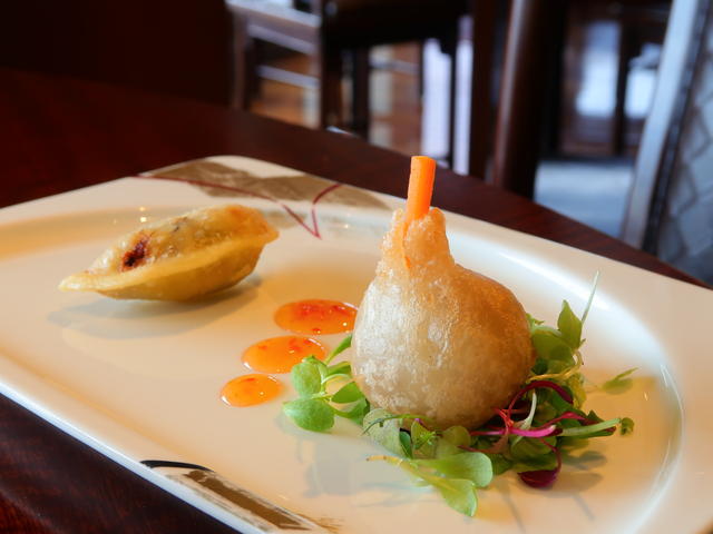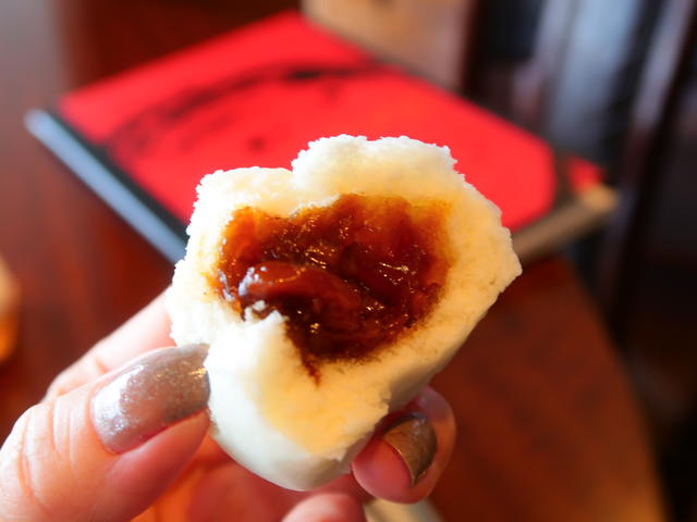 洋梨をかたどった甘いお餅の中に、いろんな食感の具材が閉じ込められていて、そのままでも、チリソースをつけてもおいしい