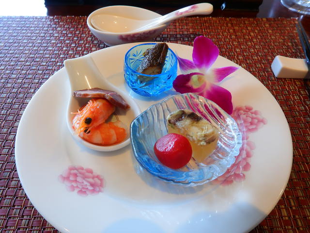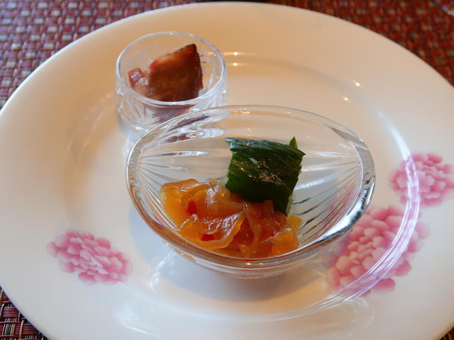 アナゴの煮こごり、蜂蜜でマリネされたプチトマト、チャーシューのスライス、旨味の染みたエビ、あゆは和風とは違って香辛料のエレガントな香りがしました。