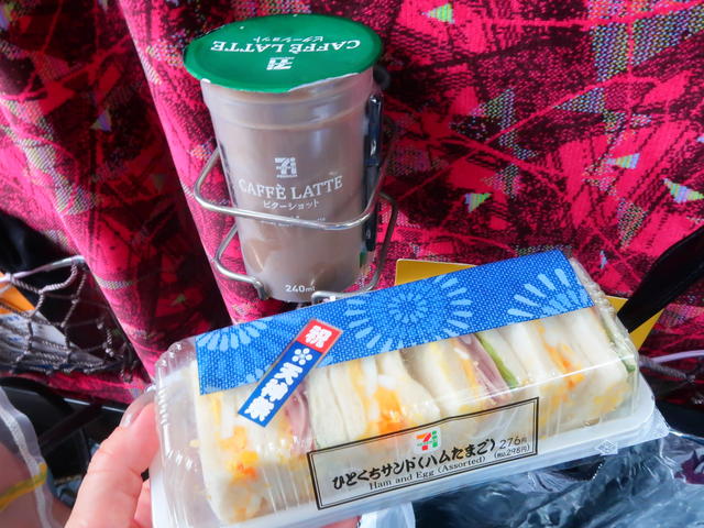 車内にて、コンビニで買った朝ごはん。