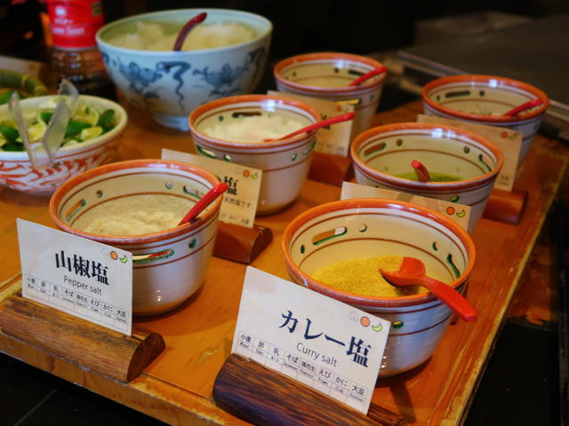 いろんな塩や薬味が用意されていて、いろんな味で食べられます。