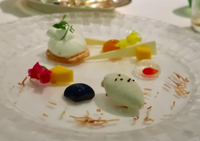 マンゴーソースでエキゾチックに。藍のアイスには藍の種がトッピングされていました。
