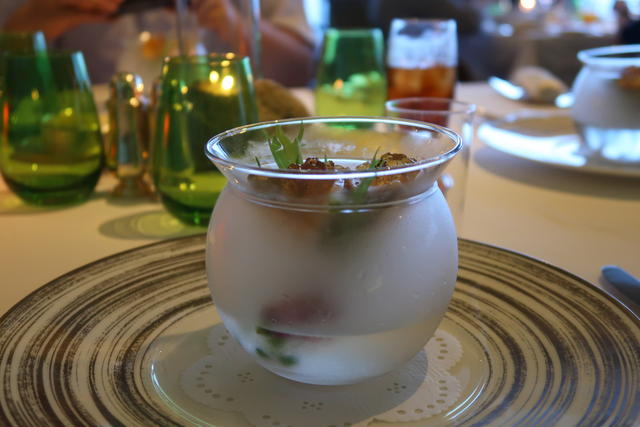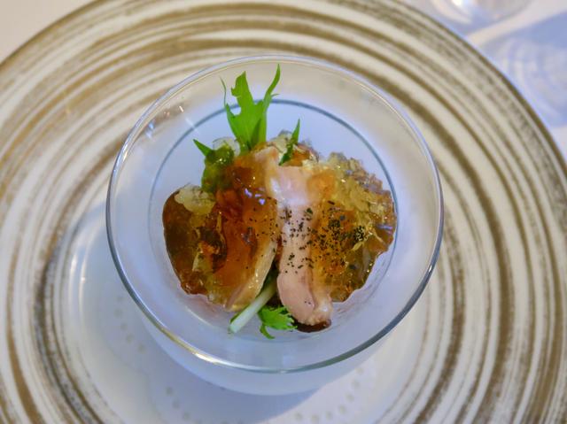 帆立貝のポシェ 藍風味のスープドポワソンジュレと共に