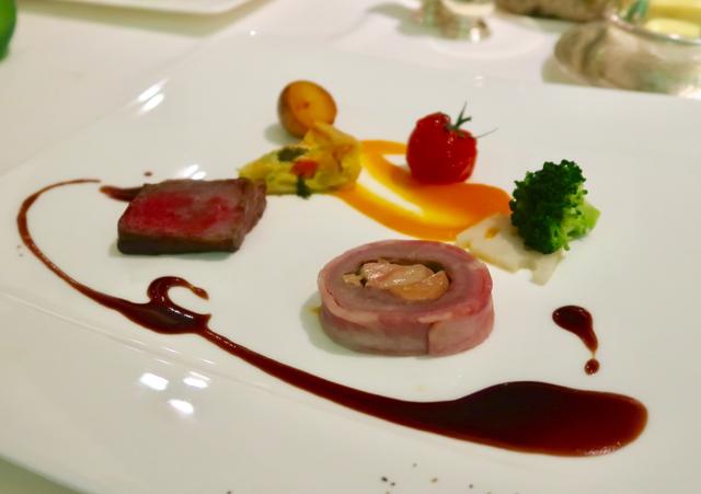 バロティーヌは仔羊の背肉とフォアグラをベーコンで巻いたもの。赤ワインソースと人参のピューレをつけていただきました♪