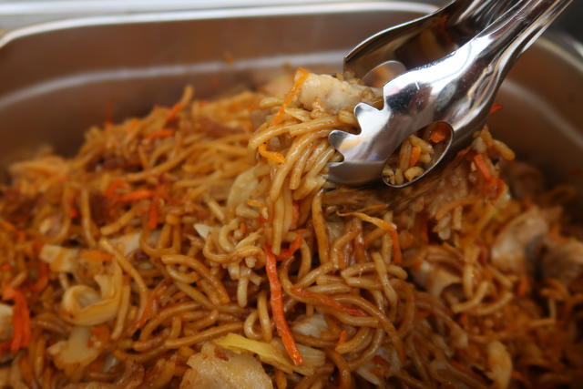 大粒の塩ゆで枝豆、大きな豚肉が入った焼きそば。