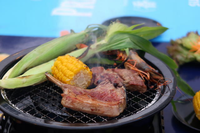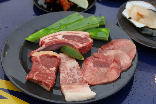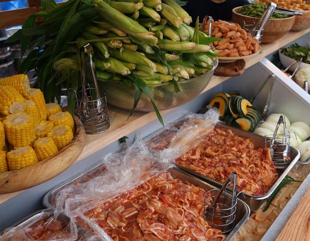 牛バラ肉・豚バラ肉・鶏もも肉、ソーセージに野菜。定番とうもろこしと房つきヤングコーンもあります。